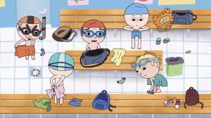 Antoine découvre dans le vestiaire qu’il a oublié son maillot de bain. Le cours de natation commence, il faut qu’il trouve une solution.